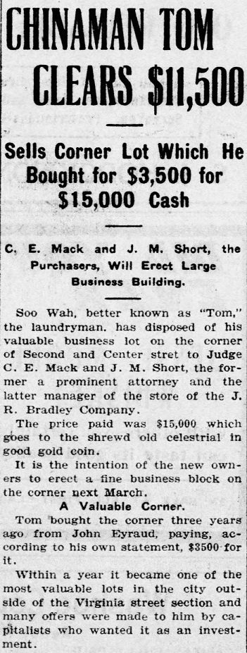 An excerpt from a 1905 newspaper article reports that Sue (spelled Soo) Wah has sold his property for the tidy sum of $15,000, netting a profit of $11,500 in just three years. | Date: October 26, 1905 | Source: Reno Evening GazetteDownload Original File