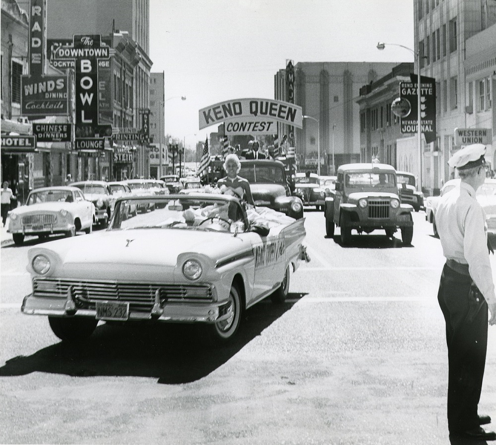 Keno Queen contestant Dorothy Fitzhugh of Las Vegas in the 1958 parade. In the truck behind her is the Ed Garland Original Dixieland band, flown to Reno from Hollywood; Garland wrote a song, “Keno Queen,” for the event. | Date: 1958 | Source: Nevada Historical Society MSNC 469Download Original File