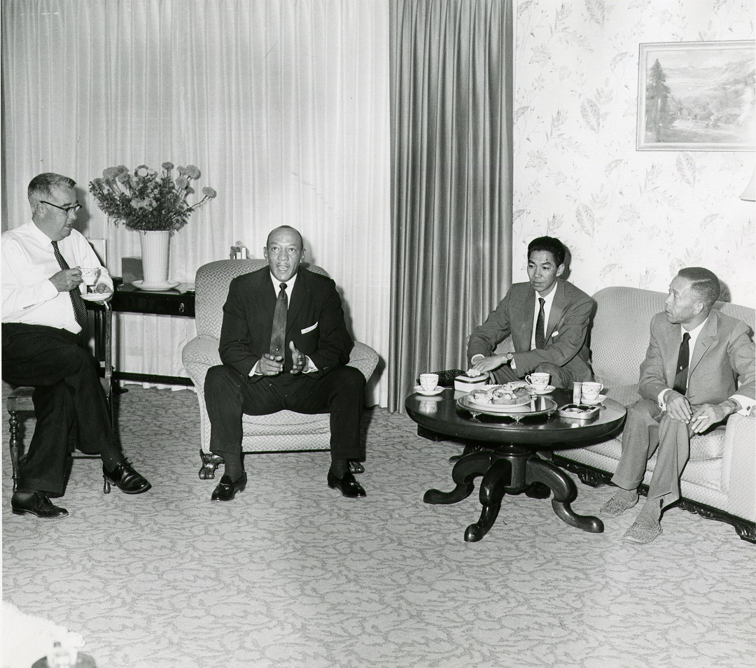 Governor's Mansion meeting ID: 2111 | This file appears in: New China Club (site) Governor Charles Russell, Jesse Owens, Bill Fong, and Tom Myles gather at the Governor's Mansion during Owens' 1958 visit to Reno for the Keno Queen contest. | Date: 1958 | Source: Nevada Historical Society MSNC 469 Download Original File SourceNevada Historical Society MSNC 469Date1958 "Governor's Mansion meeting" appears in: New China Club (site)