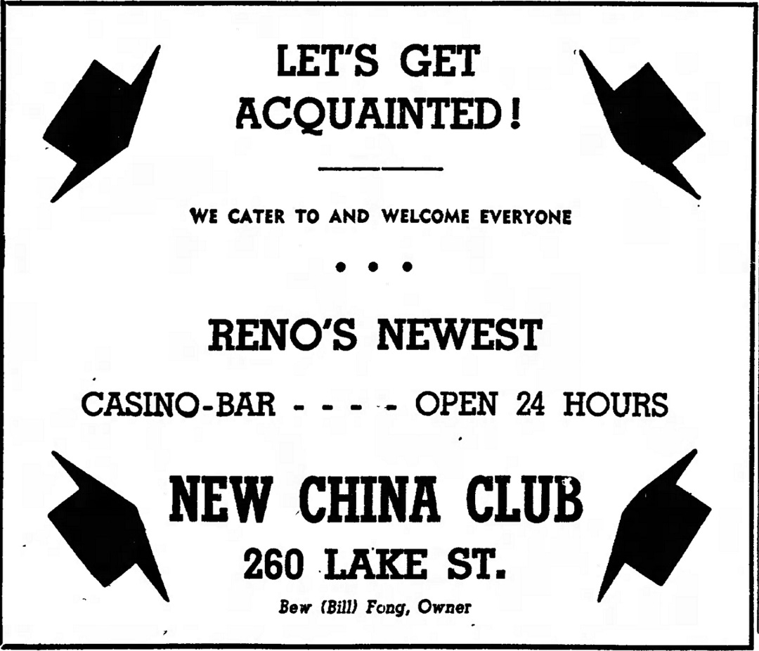 "Let's Get Acquainted!" ad ID: 2117 | This file appears in: New China Club (site) An early ad for the club appearing in the Nevada State Journal highlights that the New China Club was open to anyone, regardless of race. | Date: October 25, 1952 | Source: Nevada State Journal Download Original File SourceNevada State JournalDateOctober 25, 1952 ""Let's Get Acquainted!" ad" appears in: New China Club (site)