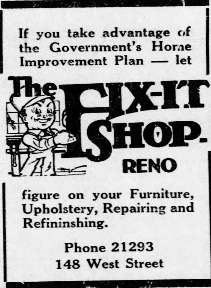 The Fix-It Shop ad, 1934 ID: 1410 | This file appears in: Hudson-Essex/Fix-It Shop Tom Joyce and O.E. LeCroy moved The Fix-It Shop into the building in 1932. LeCroy sold his interest in the business after just a few years. | Date: September 14, 1934 | Source: Reno Evening Gazette Download Original File SourceReno Evening GazetteDateSeptember 14, 1934 "The Fix-It Shop ad, 1934" appears in: Hudson-Essex/Fix-It Shop