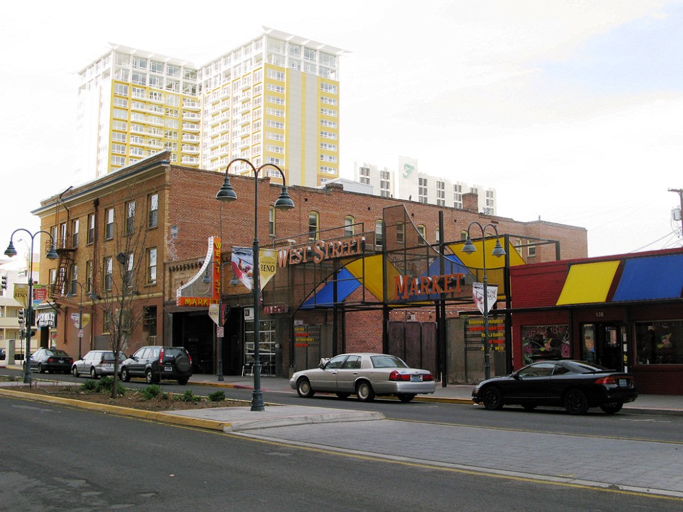 A photo from 2008 depicts the West Street Market with the Senator Hotel immediately adjacent, on the corner of West and Second Streets, and the towering Montage Condominiums (originally the Sahara Reno) rising behind. | Creator: Max Chapman | Date: 2008Download Original File