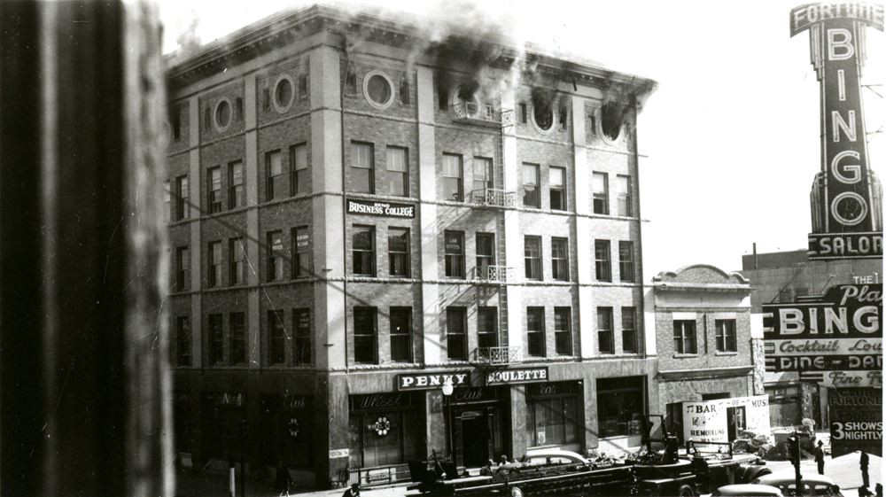 Fire, 1945 ID: 1623 | This file appears in: E.C. Lyons Building A devastating fire destroyed the building's top two floors in 1945. | Date: 1945 | Source: Special Collections, University of Nevada, Reno Libraries Download Original File SourceSpecial Collections, University of Nevada, Reno Libraries Date1945 "Fire, 1945" appears in: E.C. Lyons Building