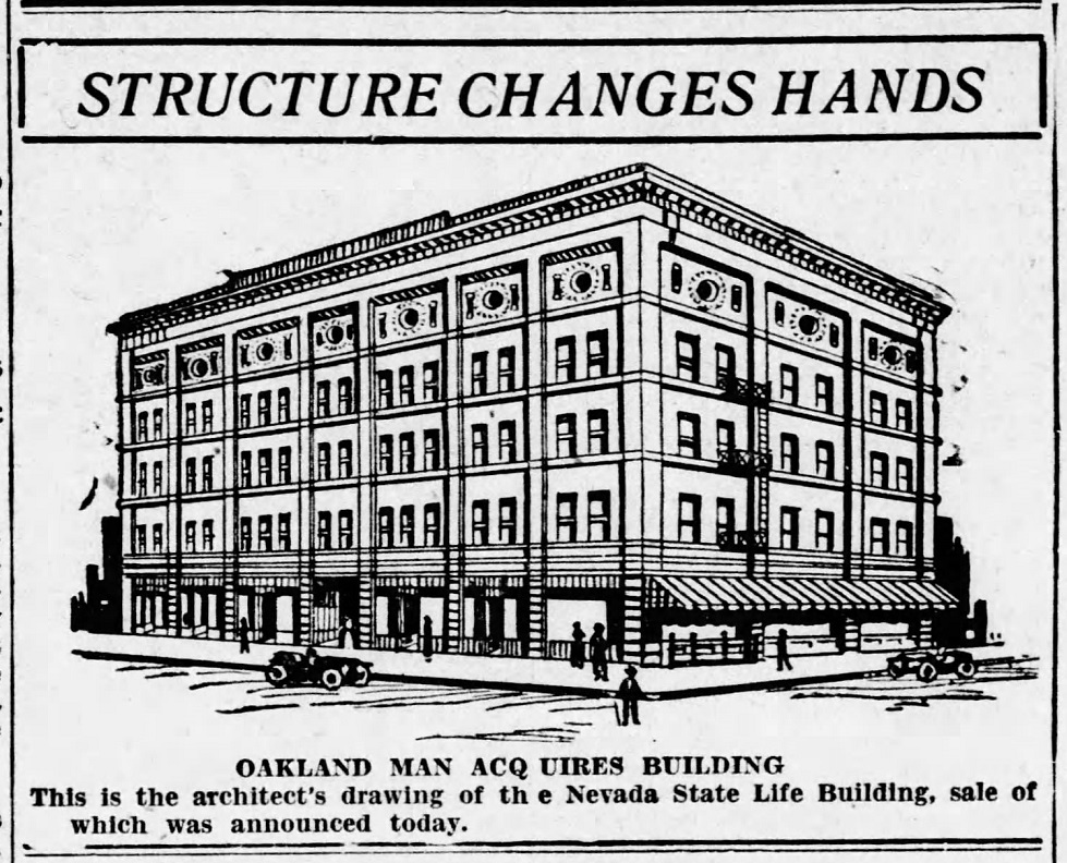 The building changed hands several times in the 1920s. The acquisition of the building in 1928 by E.C. Lyons gave the structure a new name. The prominent corner spot was at the time occupied by the Scheeline Banking and Trust Company. | Date: December 22, 1928 | Source: Reno Evening GazetteDownload Original File