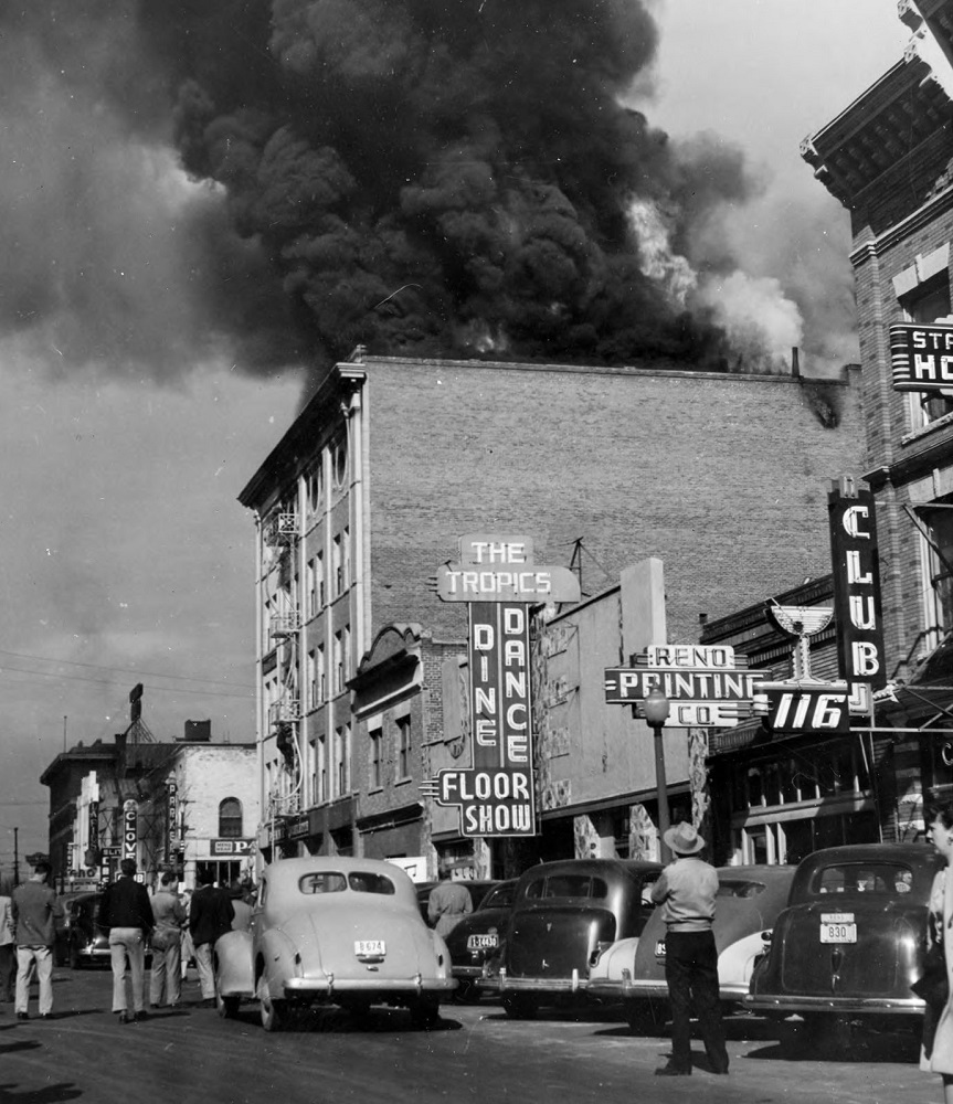 Watching the fire, 1945 ID: 1625 | This file appears in: E.C. Lyons Building Crowds gather to watch flames consume the top half of the building in 1945. | Date: 1945 | Source: Special Collections, University of Nevada, Reno Libraries Download Original File SourceSpecial Collections, University of Nevada, Reno LibrariesDate1945 "Watching the fire, 1945" appears in: E.C. Lyons Building