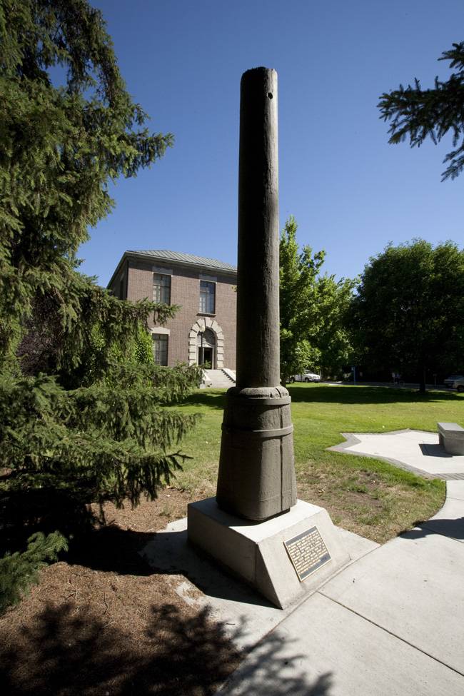 The University of Nevada's original flagpole outside the Clark Administration Building. The plaque reads "This wooden Pole is a remnant of the University of Nevada, Reno's first Flagstaff that was donated to the University by the citizens of Reno 1898. Originally 90 feet tall, it loomed high above the campus as a symbol of community support and national patriotism. It was placed, originally, in front of the University's second building, Stewart Hall, where it stood until 1959. Later, it was located between Morrill Hall and Clark Administration. It was moved to this area in 1998."