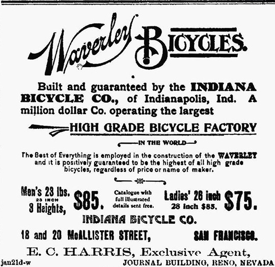 An advertisement from the Nevada State Journal in 1896 touts the high quality of Emile Harris' increasingly popular inventory. In 1895 he only sold twelve new bicycles; in 1896, he sold more than fifty.
