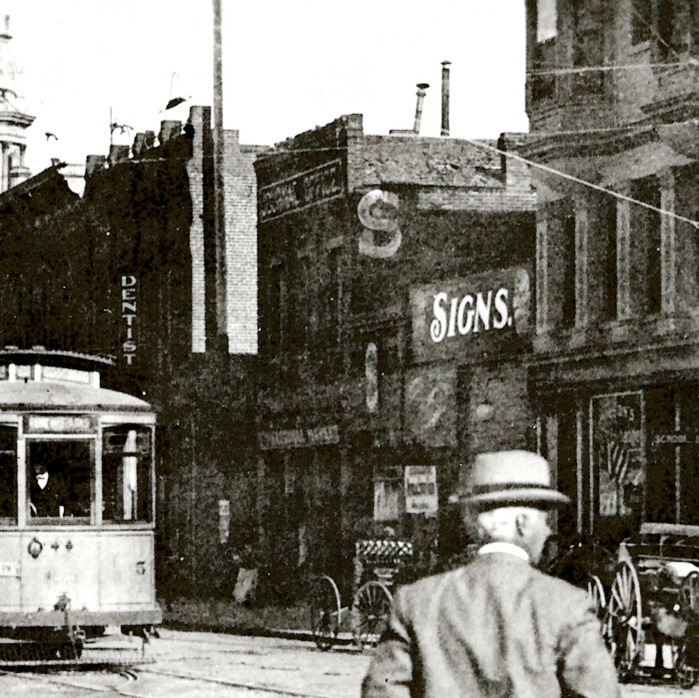 A streetcar passes the building around 1905. The Nevada State Journal moved out of the upstairs space in 1903, but the newspaper's name likely remained on the building for some time afterwards. | Date: ca. 1905 | Source: Special Collections, University of Nevada, Reno LibrariesDownload Original File